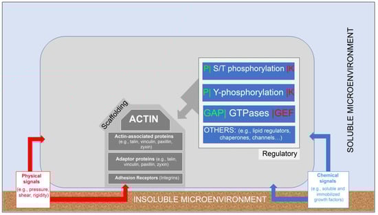Molecular and functional networking. An illustration depicting the basic interplay between cells and the surrounding soluble and insoluble microenvironments. The integrin adhesome consists of multiple molecular components that concertedly form a “scaffolding domain” that physically links the actin cytoskeleton to the extracellular matrix and “regulatory domain” that drives the assembly and reorganization of the scaffolding components. The outermost components of the scaffolding domain are diverse heterodimeric integrin receptors that bind directly to the external surfaces. Via their transmembrane cytoplasmic “tails”, integrins interact with diverse adaptor proteins (e.g., talin, vinculin, and paxillin) that directly and indirectly connect the adhesion complex to the actin cytoskeleton. The regulatory domain consists of different signaling pathways, involving different serine and threonine (S/T)- and tyrosine (Y)-specific kinases (K) and phosphatases (P). The assembly and remodeling of the adhesion sites are affected by external signals, some of which are chemical (e.g., matrix composition, adhesive ligands, and soluble and immobilized growth factors) and others are physical (e.g., matrix rigidity, pressure, shear stress, cytoskeletal polymerization, and contraction mechanics). For further details, see “Integrin adhesions as chemical and mechanical sensors of the pericellular environment” below.
