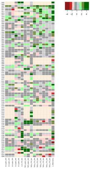 Heat plot of inflammatory screening on splenocytes and J774 cells. The y-axis represents all QSPs, while the x-axis represents the different experiments and the global inflammatory z-score (rightmost column). Each experiment is named based on its measured cytokine (IL-6 or TNFα), used cell type (spleen or J774) and incubation time (24 or 40 h). QSP concentration is 100 nM for all experiments. The colours are based on the z-score for each QSP in a specific experiment or overall for the column “z_inflammatory”. Missing data are indicated in faint yellow.