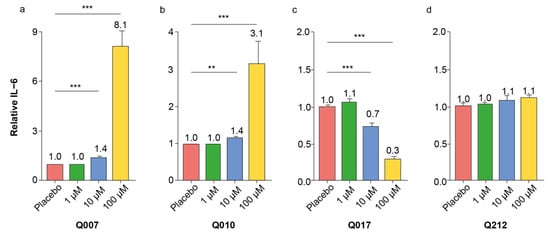Results of IL-6 ELISA after 24 h incubation of splenocytes with different concentrations of QSP. (a) Q007; (b) Q010; (c) Q017 and (d) Q212. Bars and numbers on top represent means, with error bars representing s.e.m. Asterisks indicate the following criteria of statistical significance: ** p ≤ 0.01 *** p ≤ 0.001 (two-sided t-test between placebo and specific QSP concentration).