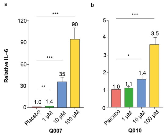 Results of IL-6 ELISA after 24 h incubation of human PBMCs with different concentrations QSP. (a) Q007; (b) Q010. Bars and numbers on top represent means, with error bars representing s.e.m. Asterisks indicate the following criteria of statistical significance: * p ≤ 0.05 ** p ≤ 0.01 *** p ≤ 0.001 (two-sided t-test between placebo and specific QSP concentration).