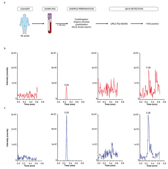 Human plasma was collected in K2EDTA-containing tubes (BD Vacutainer, Franklin Lakes, NJ, USA) and centrifuged at 1000× g for 10 min at 21 °C, within 10 min after withdrawal. The plasma supernatant was immediately transferred to 1.5 mL LoBind Eppendorf tubes on ice, and plasma sample preparation for Q010 analysis started within 20 min.