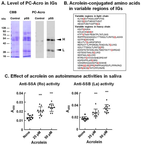 - Hirose, T.; Saiki, R.; Uemura, T.; Suzuki, T.; Dohmae, N.; Ito, S.; Takahashi, H.; Ishii, I.; Toida, T.; Kashiwagi, K.; et al. Increase in acrolein-conjugated immunoglobulins in saliva from patients with primary Sjögren’s syndrome. Clin. Chim. Acta 2015, 450, 184–189. [Google Scholar] [CrossRef] [PubMed]