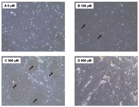 Morphological changes observed in MCF10A cells after prolonged, chronic exposure to NO containing. MCF10A cells were plated at a density of 4 × 105 per 60 mm dish and were treated with 0 (A), 100 (B), 300 (C), or 500 (D) μM DETANO twice weekly for three weeks, and then the DETANO was removed, and the cells were analyzed. Elongated cells (black arrow) were observed in NO treated cells.