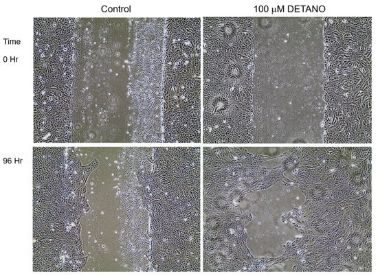 Scratch Test. NO treatment was withdrawn and MCF10A cells were seeded in 60 mm dish and grown to confluence in complete media without treatment. Upon reaching confluence, a straight line was scratched across each confluent monolayer using a 1000 μL pipette tip and the cells were allowed to close the gap in the absence of NO treatment. Top panels show the Control (left) as well as cells that had been maintained in 100 μM DETANO (right) treated MCF10A cells at time 0. The bottom panels show the same cells at 96 h; when compared to the untreated control, MCF10A cells that had been maintained in 100 μM DETANO closed the gap faster.