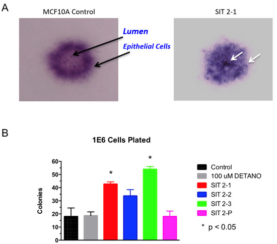 Anchorage Independent Growth in Soft Agar. (A) 6-well cell culture plates were prepared with a bottom layer consisting of 0.5% agarose in SIT medium with 5% FBS added. The top layer included 50,000 cells suspended in 3 mL of 0.3% agarose in SIT medium. Black arrows show an acini-like spheroid with hollow lumen formed by control MCF10A cells. White arrows show a clustered and disorganized spheroid formed by MCF10A cells previously maintained in 100 μM DETANO. (B) * p < 0.05 significantly increased colony formation in soft agar, when compared to untreated control.
