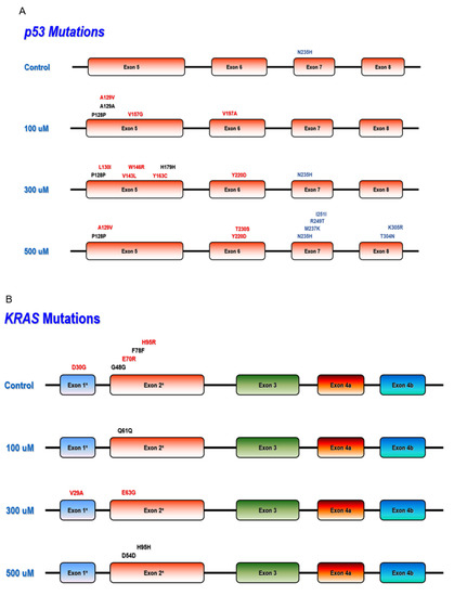 Mutations in TP53 are key drivers of carcinogenesis [40]. Moreover, P53 is a negative regulator of NOS2 [18]. In addition to TP53, PIK3CA and KRAS are also frequently mutated in many tumors. Multiple neoplasms, including head and neck cancer [41], gastric cancer [42], lung cancer [43], ovarian cancer [44], astrocytic tumors [45], breast cancer [46], glioma [47], B cell lymphoma [48], pancreatic cancer [49], and skin cancer have reported mutations within TP53, PIK3CA and KRAS mutation hot spot regions [50]. Given that chromosomal alterations were observed in the NO treated MCF10A cells, the genomic mutation status of TP53, KRAS, and PIK3CA was examined using Sanger sequencing assay [51]. The mutation rate of the TP53 gene, a recognized target of NO, is positively correlated with NO concentration [52]. Mutant hot spot regions on the TP53 gene includes the DNA binding domain, tetramerization domain, and C-terminal regulation domain found in exons 5 to 8 (Figure 4A) [53] and several mutations were identified in exons 5–8 in NO treated MCF10A cells. The significance of these findings can be explained by NO activation of p53, which can have anti-carcinogenic benefits or it can be mutagenic and raise the risk of cancer incidence [18]. NO has been demonstrated to increase p53 accumulation and phosphorylation, namely at ser-15, via ATM and ATR kinases, resulting in G2/M phase cell cycle arrest [4]. In addition, the levels of NOS2 expression and p53-P-ser15 correlated with each other and were favorably linked with the level of inflammation [54]. Consistent with nitrosative stress and the deamination of 5-methylcytosine, p53 mutations were also found in sporadic colon cancer cells and were linked to NOS2 activity in these tissues [18]. These findings uncovered a putative mechanistic relationship between NO and p53 in inflammatory cancer-prone disorders [3,4]. High NOS2 activity (>25 pmol/min/g tissue) in patient lung tissue has been substantially connected with TP53 G:C-to-T:A transversion mutation when compared to lower NOS2 activity in early stage lung cancer [55]. In breast cancer, women who carry germline TP53 mutations have up to 85% increased risk of breast cancer by age 60. Approximately 5–8% of women diagnosed with breast cancer under age 30 had germline TP53 gene mutation [56]. Importantly, tumor NOS2 expression and P53 mutation positively correlated in aggressive ER- breast tumors [7].