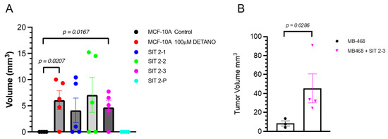 Assessment of the malignant growth potential of subclones in nude mice. (A) 100 μM DETANO treated MCF10A parent cells, and the SIT 2-3 clonal population formed small masses in nude mice that were significantly larger than control untreated MCF10A cells. (B) When compared to MB-468 cells alone, MB-468 cells injected with SIT 2-3 cells formed significantly larger tumors. Mice were euthanized at 30 days post-cell injection.