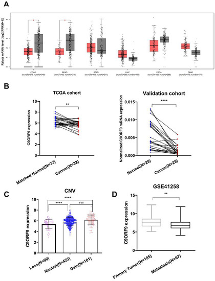 Gene expression analysis of C9orf9 in multiple samples of digestive tumor patients. (A). Analysis of C9orf9 expression in five digestive tumors from TCGA and GTEx samples. * p < 0.05. T: tumor (red), N: normal (grey). (B). C9orf9 expression level in tumor and matched normal tissues from TCGA and local validation cohort. ** p < 0.01, *** p < 0.001. (C). Correlation between copy number variation (CNV) and C9orf9 expression level in TCGA cohort. **** p < 0.0001. (D). C9orf9 is downregulated in metastatic tumor samples of CRC, data from GSE41258. ** p < 0.01.