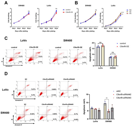 C9orf9 has limit effect on cell growth. (A). Overexpression of C9orf9 in SW480 and LoVo cells did not affect cell proliferation. (B). Knockdown of C9orf9 slightly promoted cell proliferation in LoVo cells, but not in SW480. (C). Cell apoptosis analysis using Annexin/PI double staining in LoVo and SW480 cells transfected with C9orf9 expression plasmid. (D). Cell apoptosis analysis using Annexin/PI double staining in LoVo and SW480 cells transfected with C9orf9-specific siRNAs. Ns, not significant, ** p < 0.01, *** p < 0.001, **** p < 0.0001.