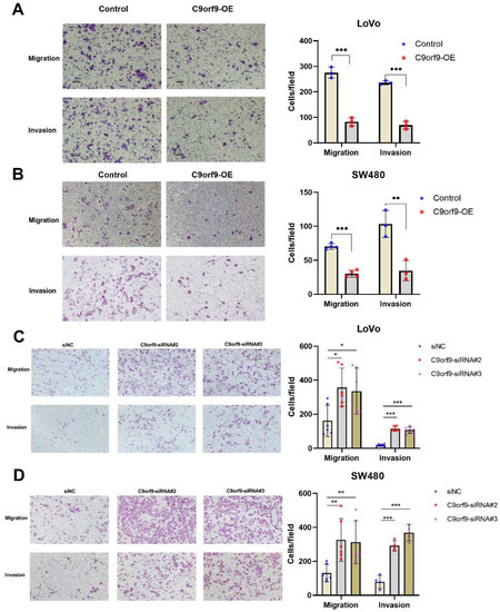 C9orf9 regulates LoVo and SW480 cell migration and invasion capacity. Transwell assays (Matrigel-free) or Transwell invasion assays (coated with Matrigel) were performed, respectively, in control and C9orf9-overexpression LoVo (A) and SW480 (B) cells. (C). Cell migration and invasion assays in control and C9orf9-knockdown LoVo cells. (D). Cell migration and invasion assays in control and C9orf9-knockdown SW480 cells. * p < 0.05, ** p < 0.01, *** p < 0.001.