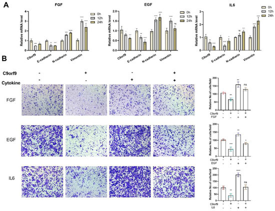 C9orf9 responds to and involves in FGF, EGF, and IL6 induced EMT. (A). Q-PCR analysis of C9orf9 and EMT-related markers (E-cadherin, N-cadherin, Vimentin) in FGF (20 ng/mL), EGF (20 ng/mL), and IL6 (50 ng/mL)-stimulated SW480 cells at 0, 12, and 24 h. (B) Transwell (Matrigel-free) assays of LV-NC and LV-C9orf9 SW480 cells with or without cytokine stimulation. * p < 0.05, ** p < 0.01, *** p < 0.001, **** p < 0.0001.