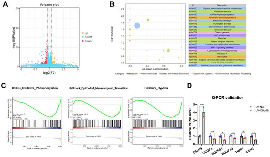 To reveal the role of C9orf9 in CRC, we performed RNA-seq to identify the downstream genes and pathways regulated by C9orf9. Differentially expressed genes (DEGs) between the LV-NC and LV-C9orf9 LoVo cells are shown in Figure 7A. In total, 69 genes were up-regulated and 184 were down-regulated (|FC| ≥ 1.5, p < 0.05). Surprisingly, we found that most DEGs were enriched in the metabolism pathway and oxidative phosphorylation (OXPHOS) pathway (Figure 7B). Considering that C9orf9 greatly influences migration, invasion, and the EMT phenotype, we then focused on the metastasis-related gene sets through Gene Set Enrichment Analysis (GSEA). The genes in the OXPHOS, EMT, and hypoxia sets were significantly enriched and highly expressed in the control groups (Nominal p < 0.05, Figure 7C). We selected significant DEGs for QPCR validation, among which VEGFA (angiogenesis-related), TIMP1, CDH2 (EMT-related), and NDUFs (OXPHOS-related) were consistent with the RNA-seq results.