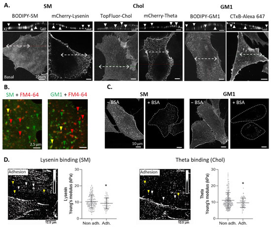 To confirm the existence of submicrometric domains in a label-free manner with high spatial resolution while evaluating their membrane stiffness [33,36], AFM using lysenin- and theta-derived tips was conducted sequentially on the same cells. Results confirmed the presence of lipid clusters (Figure 1D, arrowheads). Those clusters presented a slightly lower membrane stiffness than the bulk membrane (Figure 1D, right), which agrees with the lower stiffness of lipid domains at the RBC surface [35,48]. A proportion of lipid clusters were revealed by both tips, suggesting co-enrichment in SM and chol (Figure 1D, yellow arrowheads). Altogether, these data indicated that SM-, chol-, and GM1-enriched domains were present at the myoblast surface and that these domains were softer than the bulk membrane.