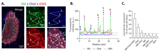 To address those questions, myoblasts were simultaneously triple-labeled for SM, chol and GM1, and their enrichment in domains was quantified using fluorescence intensity profiles drawn in myoblast periphery regions where domains were best visible (Figure 2A,B). Results showed that ~45% and ~25% of total domains at the myoblast surface were respectively enriched in SM/chol/GM1 and chol and that those two types of domains coexisted with a third, less abundant type of domain, enriched in SM/chol, and other domains even less abundant (Figure 2C).