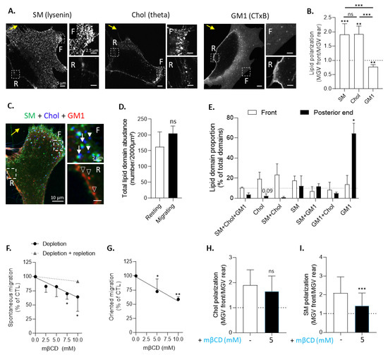 Since the major domains present at the leading edge contained chol, we determined the impact of chol depletion on the extent of migration and the polarization of chol and SM. Two types of migration tests were developed: spontaneous migration in a cell-free surface of Ibidi chambers and oriented migration in Transwell chambers towards a gradient of IGF-1 [49]. Spontaneous and oriented migration decreased similarly after mβCD treatment (Figure 4F,G). Chol repletion with mβCD:chol complexes restored myoblast spontaneous migration, again supporting the non-toxicity of mβCD treatment (Figure 4F, triangle at 10 mM). Moreover, chol depletion decreased SM but not chol polarization (Figure 4H,I). Altogether, the above data suggested the implication of chol for myoblast movement, particularly the polarization of SM/chol-enriched domains at the migration front.
