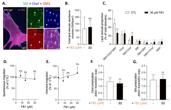 Sphingolipid synthesis inhibition by fumonisin B1 decreases the proportion of SM/chol/GM1- but not of chol-enriched domains and does not decrease myoblast migration nor lipid polarization. (A–C) Cells were pretreated or not with FB1 then triple-labeled (BODIPY-SM, theta, CTxB; (A) and quantified for lipid domain abundance relative to the cell surface (B) and lipid domain proportion (C), as in Figure 2. White arrowheads indicate the SM/chol/GM1-enriched domains; blue arrowheads indicate the chol-enriched domains. Dotted line indicates the threshold for lipid domain acknowledgement. The data are expressed as mean ± SD (n = 10 cells for each condition from 2 independent experiments; 10–15 profiles drawn and 150–200 domains analyzed/cell). Wilcoxon signed-ranked test and two-way ANOVA followed by Sidak’s multiple comparisons test. (D,E) The quantification of myoblast spontaneous (D) or oriented (E) migration in Ibidi chambers or transwells towards IGF-1 after FB1 treatment. The data are expressed as mean ± SD (n = 5–10 independent experiments). Kruskal–Wallis test followed by Dunn’s multiple comparisons test. (F,G) The quantification on single-labeled cells of chol (theta, F) and SM (lysenin, G) polarization after 5 h of migration in control conditions or after pretreatment with FB1. The data are expressed as the ratio of the MGV at the front vs. the MGV at the rear (n = 8–16 cells from 1–2 independent experiments). Dotted line indicates no polarization. Unpaired t-test. The statistics above the columns refer to the corresponding control.