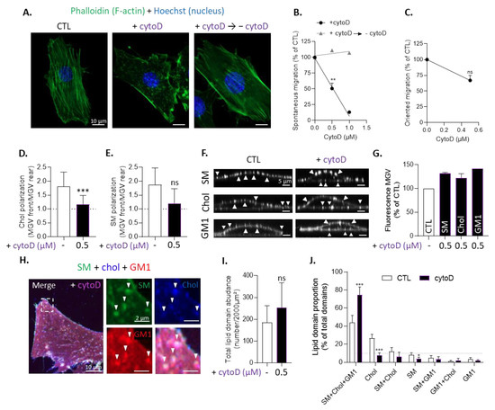 To next test for a potential functional relationship between lipids, migration, and F-actin, we then disrupted the actin cytoskeleton using cytoD (Figure 6A) and evaluated its impact on myoblast migration and lipid polarization. CytoD treatment reversibly impaired myoblast spontaneous migration and, to a slighter extent, oriented migration (Figure 6B,C) and decreased both chol and SM polarization, although not significantly for SM (Figure 6D,E). This prompted us to analyze the chol distribution at the cell front in more detail. We found that, instead of being clustered in domains in the lamellipodia region, the chol distribution at the leading edge of cytoD-treated cells was less clustered and enriched in filopodia. This effect was specific since, upon mβCD, domains were smaller and less abundant but the lamellipodia area was still present (Figure S7C).