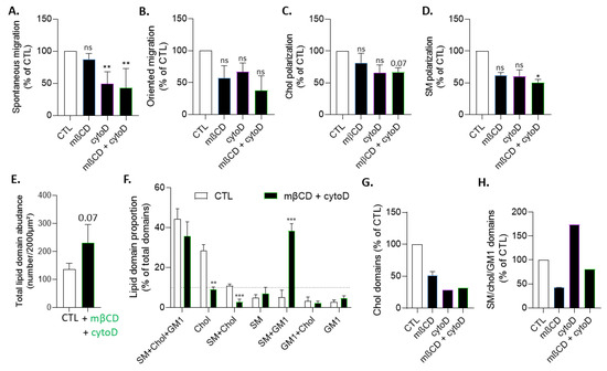 To further test this interplay, myoblast migration, chol content, chol and SM polarization, and lipid domain abundance and proportion were evaluated upon treatment with mβCD, cytoD, or a combination of both compounds. To avoid cell toxicity potentially resulting from the combination of drugs, we used the lowest drug concentration to significantly impact lipid-enriched domains. As expected, the combined treatment decreased chol content similarly to mβCD treatment alone (Figure S4). More importantly, it induced similar effects as cytoD alone on both migration (Figure 7A,B), chol and SM polarization (Figure 7C,D), and chol-enriched domain proportion (Figure 7E–G), indicating the almost complete abrogation of the mβCD effect on those parameters in actin-depolymerized myoblasts. In contrast, the decreased proportion of SM/chol/GM1-enriched domains induced by mβCD was preserved in actin-depolymerized myoblasts (Figure 7F,H). Altogether, these data further supported that the proportion of chol- but not SM/chol/GM1-enriched domains at the resting state and chol and SM polarization at the front interplayed with the actin cytoskeleton.