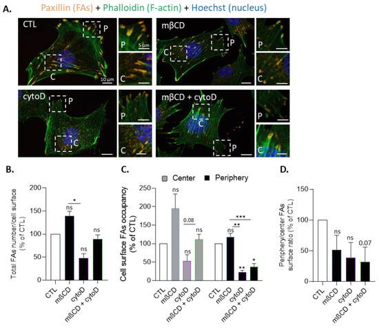 To further study this hypothesis, we evaluated FA abundance and distribution upon mβCD combined or not with cytoD treatment on resting myoblasts through immunolabeling of paxillin, a FA scaffolding protein. Chol depletion tended to increase the total number of FAs relative to the cell surface and the surface occupancy, specifically in the center of the cell, whereas cytoD decreased both parameters (Figure 8A–C). The ratio of periphery vs. center FA surface occupancy was decreased whatever the treatment, and the effect of mβCD was abrogated in actin-depolymerized myoblasts (Figure 8D), suggesting the interplay between chol and F-actin in the control of FA distribution.
