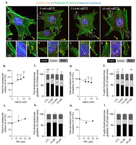 Chol depletion also slightly decreased the F-actin distribution at the cell front in favor of a higher central occupation without affecting the total cell surface occupancy (Figure 9D,E). Those modifications were accompanied by a mβCD concentration-dependent decrease of the cell front surface at the benefit of the cell center surface but with the preservation of the rear surface (Figure S9A).