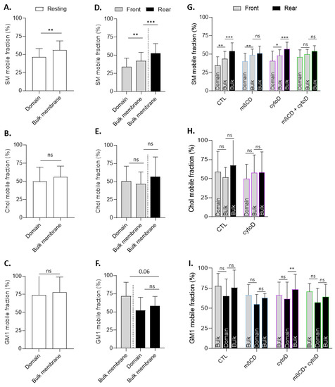 We finally tested whether SM/chol- and chol-enriched domains present at the leading edge could exhibit different biophysical properties than GM1-enriched domains at the trailing edge and whether this could depend on the chol and actin cytoskeleton. To do so, membrane lipid lateral diffusion was measured by FRAP on lipid domains vs. the bulk membrane area, both on resting and migrating myoblasts, while distinguishing the front and the rear. In resting myoblasts, the mobile fraction of SM and chol was ~50% vs. ~75% for GM1, suggesting that the lateral mobility of the former lipids was more restricted than the latter. Moreover, the lateral diffusion of SM associated with domains was significantly more restricted than SM in the bulk membrane, which was not the case for chol and GM1 (Figure 10A–C). Similar observations were made in myoblasts upon migration, revealing SM-specific higher restriction in domains than in the bulk membrane at the front and higher restriction at the front than at the rear (Figure 10D–F). This restriction was entirely abrogated upon combined mβCD and cytoD treatments, suggesting that the SM-restricted mobility at the front was related to both chol and the actin cytoskeleton. In contrast, chol and GM1 membrane lateral mobility was not affected by those treatments (Figure 10G–I). Altogether, those data supported the specific functional interplay between SM-enriched domains, the F-actin network, and chol at the leading edge.