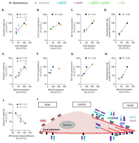 The implication of chol- and SM/chol-enriched domains at the leading edge is supported by the excellent positive correlations of their abundance with myoblast migration, chol and SM polarization, and FA distribution at the cell periphery, except for SM/chol domains with chol polarization (Figure 11A–H). Several arguments supported the possibility that these two types of domains contributed to myoblast migration by different mechanisms. First, although the proportion of SM/chol-enriched domains was minor compared to chol-enriched domains on resting myoblasts (~5% vs. ~25%), they became even more abundant than chol-enriched domains upon migration at the expense of SM/chol/GM1-enriched domains, which suggests a role for those domains as well. Second, both domains presented a differential interplay with the cytoskeleton and different biophysical properties, as discussed in Section 4.5. Third, upon FB1, the increase of SM/chol-enriched domains was accompanied by a slight increase in migration, whereas chol-enriched domains were preserved. Fourth, the coexistence and differential roles of chol- and SM/chol-enriched domains at the leading edge vs. GM1 at the trailing edge were reminiscent of the coexistence of three populations of lipid domains at the RBC surface and their different roles during RBC deformation [35].