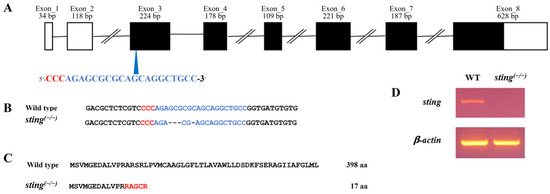 Generation of sting(−/−) zebrafish. (A) Schematic illustration of organization of zebrafish sting. The white and black boxes represent untranslated regions and open reading frames, respectively. The blue arrowhead indicates the single guide RNA (sgRNA) target site. The PAM and the sgRNA target sequences are indicated in red and blue letters, respectively. (B) The obtained mutation in sting(−/−) fish using CRISPR/Cas9 gene editing. Deleted nucleotides in the sting(−/−) genome are indicated with hyphens. (C) Amino acid prediction of Sting in the sting(−/− ) and WT zebrafish genomes. The altered amino acids are represented with red letters. (D) Confirmation of mutation via RT–PCR using sting(−/−) mutation-specific primers in 7 dpf larvae of sting(−/−) and WT zebrafish.