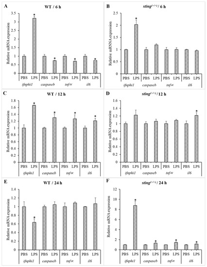 Comparison of gene expression in WT and sting(−/−) zebrafish larvae under LPS stimulation. The larvae samples were collected 6, 12, and 24 h post-LPS treatment of 3 dpf WT ((A,C,E) respectively) and sting(−/−) ((B,D,F) respectively) zebrafish larvae. Ef1∝ was used as an internal control to analyze the relative mRNA expression of genes downstream of sting using the Livak method. Transcription levels of target genes in the PBS-treated group were considered as 1, and expression levels in the LPS-treated groups were normalized to those in the PBS-treated group and are represented as fold values. Standard deviation (SD; n = 3) is indicated by the error bars. Significantly differentially transcribed genes (when compared to the respective PBS-treated control) are marked with an asterisk (*: p < 0.05).