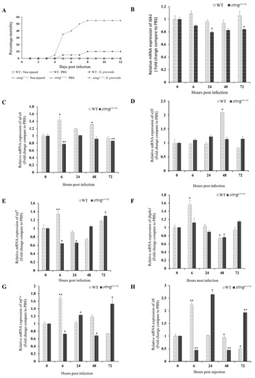 For the challenge experiment, WT and sting(−/−) zebrafish were divided into three groups, each containing 24 zebrafish, and a wound was generated in two groups before bacterial treatment. These two groups (one from both WT and sting(−/−)) were exposed to E. piscicida at the final concentration of 108 CFU/mL in a total volume of 300 mL for 5 h, and the other was maintained as a PBS-treated control without injury. The bath immersion and maintenance of zebrafish were performed as described in the mortality experiment. In addition, the zebrafish were not fed after bath immersion. Tissue samples, including the internal organs and muscles, at the infected site of six zebrafish from each group were collected at 6, 24, 48, and 72 h post-infection (hpi), as shown in Supplementary Figure S2A. Immediately after collection, tissue samples were snap-frozen in liquid nitrogen. RNA extraction and cDNA synthesis were performed as described in Section 2.6. The expression of downstream genes, including tbk1, irf3, irf7, nf-κb, tnfα, ifnphi1, il6, and an internal control gene elongation factor-1α (ef1α) in WT and sting(−/−) zebrafish were analyzed by qPCR at different time points post-E. piscicida challenge. Relative expression of the target genes was calculated with respect to ef1α expression using the Livak method [28,29]. The expression of target genes in E. piscicida-infected samples were normalized with respect to the PBS-treated controls.