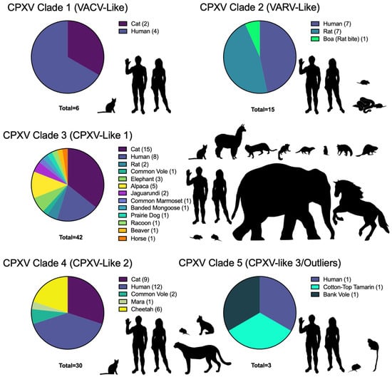 Hosts of fully sequenced CPXV isolates. Pie charts represent isolates in CPXV major clade classifications based on Figure 1 (Franke et al. [14] designations in parentheses) and the proportion of the pie represents the number of isolates from that host species. Legend to the right of each chart has the common names of host species, number of cases in parentheses, and follows the clockwise orientation of chart slices. Silhouettes are representative of the infected species. For image rights and licenses see Supplementary File S3.