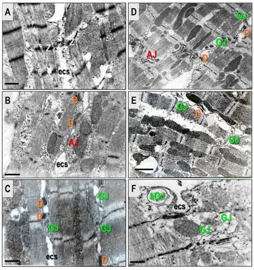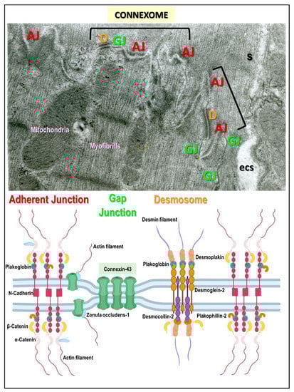 Intercalated discs comprise three distinct junctional complexes, the “connexome”: adherens junction (AJ), desmosome (D), and gap junction (GJ). These work together to mediate cardiomyocyte mechanical and electrical coupling. There are also various interacting proteins that can modulate connexome function [,,,,,,,]. Disorders of this complex structure appear to be pro-arrhythmic and promote mechanical heart dysfunction.Electron microscopic images adapted from [].
