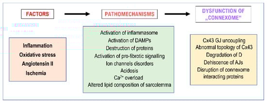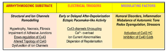 Research indicates that abnormal Ca2+ handling, Ca2+-overload, and ischemia-related acidosis induce Cx43-GJ uncoupling. When this is combined with ion current abnormalities, it can trigger the electrical disorders that initiate AF or VF occurrence [,,,,,].