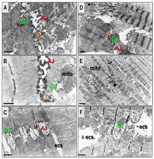 Electron microscope images illustrate connexome impairment in SHR hearts. Varying degrees of AJ dehiscence are apparent in images (A–C), and these are accompanied by GJs loss. The connexome impairment also results in asynchronized contractions of neighbouring cardiomyocytes (A,D). Long-lasting HTN related structural remodeling includes severely injured cardiomyocytes, with the destroyed connexome at the intercalated disc (arrowhead in (E)) and on the cardiomyocytes lateral side (F). This is accompanied with progressive fibrosis. Scale bar represents 1 micrometer. Adapted from [].