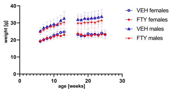 The graph shows the weight progression of early treated (left) and late treated animals (right) for all experimental groups. FTY—fingolimod (FTY720)-treated animals; VEH—vehicle-treated control animals. Data are presented as mean ± SD; n = 8 in all groups, except for the late treatment males (n = 13). Statistical analysis was performed using two-way ANOVA (mixed-effects model). No significant differences were found.