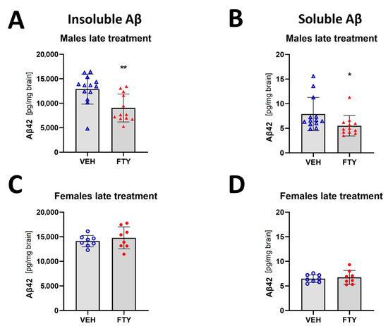 Quantification of insoluble (A,C) and soluble (B,D) Aβ42 for late treated males (A,B) and females (C,D) APPtg mice. Data are presented as mean ± SD; n = 8 (except for males VEH, n = 13; FTY, n = 12). Significance was calculated using Wilcoxon–Mann–Whitney test, and it is given as *: p ≤ 0.05, **: p ≤ 0.01.