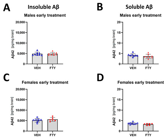Quantification of insoluble (A,C) and soluble (B,D) Aβ42 for early treated males (A,B) and females (C,D). Data are presented as mean ± SD; n = 8 (except for FTY treatment females, n = 6). Significance was calculated using Wilcoxon–Mann–Whitney test.