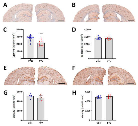 Evaluation of micro- and astrogliosis in mice with late treatment paradigm (at 175 days of age). (A,B) Representative images of Iba1 immunostaining of male (A) and female (B) mice. Microglia activation was determined as density of IBA1-positive cells in males (C) and females (D). (E,F) Representative images of GFAP immunostaining in males (E) and females (F). Astrocyte density in males (G) and females (H). Data are presented as mean ± SD; VEH males n = 13 for IBA1, n = 5 for GFAP, FTY males n = 12 for IBA1, n = 6 for GFAP, females n = 8. Significance was calculated using Student’s t-test, and it is given as ***: p ≤ 0.001. Scale bars: 1 mm.