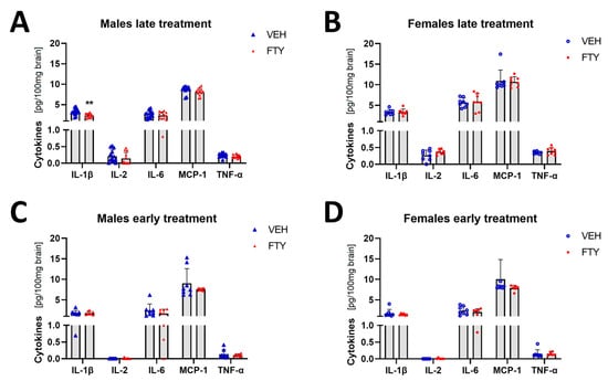 Levels of selected cytokines in brain tissue in late and early treated animals. (A,B) Quantification of IL-1β, IL-1, IL-6, MCP-1, and TNFα in late treated males (A) and females (B). (C,D) Quantification of the cytokines in early treated males (C) and females (D). Data are presented as mean ± SD; n = 8 except late treatment males (VEH n = 13; FTY n = 12) and early FTY treatment females (n = 6). Significance was calculated using Student’s t-test, and it is given as **: p ≤ 0.01.
