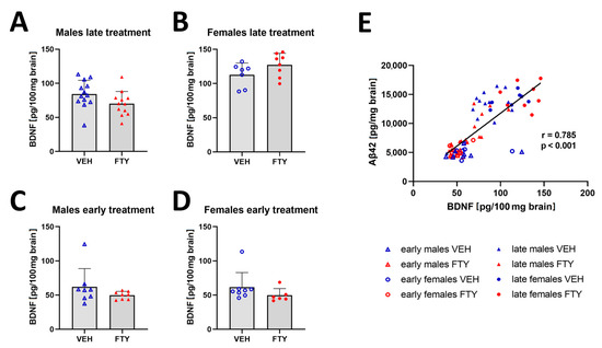 Previous studies have reported that fingolimod increased the BDNF concentration in the brain [20,29]. Thus, we quantified BDNF in the brain extracts in all of the experimental groups. We found a trend (non-significant) of decreased BDNF levels only in late treated males in comparison to that of their control group (70.1 ± 17.2 vs. 84.3 ± 19.3, p = 0.06). The remaining groups showed no significant difference in the BDNF levels (Figure 6). However, the BDNF concentration positively correlated to the Aβ levels in all of the groups (r = 0.785; p < 0.001).