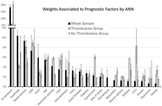 Because BI-admission heavily weights the results of ANN, a recursive confirmatory analysis was performed after removing this factor from the input variables. Re-running the classification on the whole sample, the factors that accounted for a percentage of importance >5% were: global aphasia (16%), USN (13%), time from stroke (12%), age (11%), dysphagia (9%), TACI (9%), and Wernicke’s aphasia (5%). These results substantially confirmed those of the primary analysis.