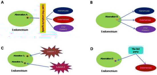 Possible scenarios in which endometrial aberrations do not cause endometriosis exclusively. (A) In this scenario, endometrial aberration A may be associated with a particular symptom, which is not specific to endometriosis. (B) Endometrial aberration B could lead to multiple conditions, including endometriosis. (C) Endometrial aberrations C1 and C2 are the consequences of endometriosis, where C1 and C2 are induced by different lesions of possibly different subtypes and/or their proximity to uterus. (D) Endometrial aberration D, along with endometriosis, is the result of a third, unknown factor. Lines without arrows indicate an association. The directional arrows indicate the causal relationship.