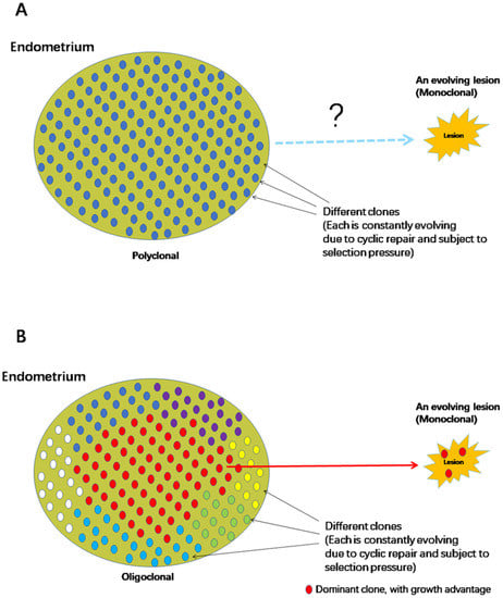 Two scenarios showing the complex phylogenetic relationship between the polyclonal endometrium and monoclonal endometriotic lesion. (A) Both eutopic and ectopic endometria are each evolving at their own pace and tempo and in their separate microenvironments, which makes any inference related to the phylogenetic relationship between the two entities challenging. (B) Because of cancer-associated mutations that confer selective growth advantages, the endometrium may become oligoclonal. Some clones may dominate and occupy larger areas of the endometrium. Since the chance of test sample coming from the dominant clone is thus increased substantially, this would help establish the phylogenetic relationship between eutopic and ectopic endometrium should the retrograde menstruation theory be true. However, it poses a challenge in establishing that a clone harbouring a particular mutation confers higher risk of developing endometriosis than those without.