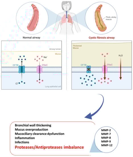 One of the most important features of CF onset is progressive lung remodeling promoted by a significant increase in protease activity. In fact, CF patients have an imbalance between proteases and protease inhibitors, required physiologically for the equilibration of defense mechanisms and prevention of tissue damage [34]. The alteration of these dynamic network leads to proteolytic activity dysfunction in the lung as reported by many studies that brought to light changes in protease levels, notably in MMPs [35].
