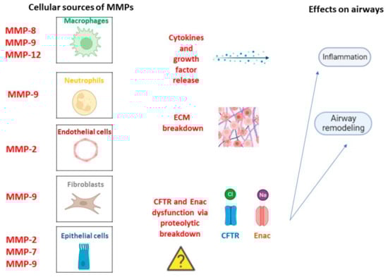 MMPs are a superfamily of metallo-endopeptidases known as metzincins, synthesized as inactive proenzymes by several structural and immune cells such as macrophages, neutrophils, epithelial cells, endothelial cells, and fibroblasts [36]. While polymorphonucleates produce MMPs in a constitutive manner, many other cells release MMPs only after an inflammatory trigger and stimulation related to tissue remodeling and wound repair by transcription factor modulation [37]. Once synthesized, they became active by specific cleavage and, in turn, can cleave targeted substrates to perform biological functions. In fact, they contribute to the destruction of connective tissue and the alveolar epithelium, the release of cytokines and growth factors, and the regulation of cell mobility and migration by extracellular matrix (ECM) remodeling [38]. Moreover, they are involved in the wound repair process thanks to their capacity to catalyze the normal turnover of the ECM. In general, elevated MMP activity results in harm to lung homeostasis with low ECM turnover associated with an impaired repair phenomenon or excessive ECM accumulation associated with tissue fibrosis [39]. Moreover, MMPs can influence CFTR and ENAC channel structures via proteolytic breakdown, contributing to CF pathogenesis and progression [40]. Regardless of the molecular mechanism via which MMPs can promote CF onset, their role in the disease is supported by huge studies. For example, MMP-1, MMP-8, and MMP-9 levels were found higher in CF patients than in healthy controls [41]. Interestingly, a major increase in MMP-1 was observed during symptom exacerbations, indicating MMPs as potential additive biomarkers of disease severity. In contrast, other studies suggested a protective role of MMP-10 against bacterial infection because of its ability to modulate macrophage inflammation. However, the changes in MMP levels are often correlated to changes in MMP inhibitors such as α2-macroglobulin and the tissue inhibitors of metalloproteinases (TIMPs) [42]. A relationship between MMP and bacterial infection in CF subjects has also been found. Lastly, neutrophil elastase (NE) activity was found to be higher in CF childhood BAL, and its levels correlated with FEV1 [43]. Overall, MMPs can exert both beneficial and deleterious effects depending on the cellular source and the disease stage, Figure 2.