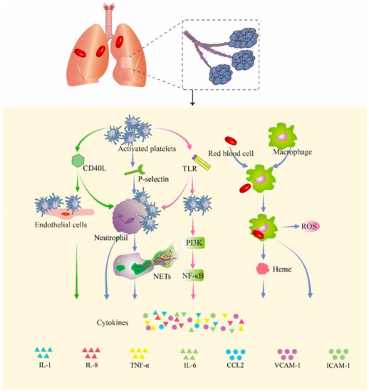 Hemorrhage promotes inflammation in PBLI. Activated platelets express a variety of cell surface proteins such as CD40Ls, P-selectins, and TLRs to trigger inflammation responses. The p-selectin expressed by activated platelets mediates the binding of platelets to neutrophils. CD40L mediates the binding of platelets to endothelial cells and neutrophils. The expression of TLRs in platelets promotes binding with neutrophils. Upon binding, neutrophils, endothelial cells, and activated platelets initiate an inflammatory response that promotes the release of cytokines. The red blood cells that leak into the alveoli are swallowed by macrophages and release heme and globulin. Heme induces the release of ROS and activation of the NF-κB signaling pathway in macrophages, thereby triggering inflammation. CD40L: cluster of differentiation 40 ligand; NETs: neutrophil extracellular traps; TLR: Toll-like receptor; PI3K: phosphoinositide 3-kinase; NF-κB: nuclear factor kappa B; ROS: reactive oxygen species; IL-1: interleukin-1; IL-8: interleukin-8; TNF-α: tumor necrosis factor-α; IL-6: interleukin-6; CCL2: C–C motif chemokine ligand 2; VCAM-1: vascular cell adhesion molecule 1; ICAM-1: intercellular adhesion molecule 1.