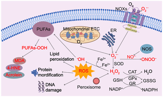 Regulation of ROS generation and clearance. Intracellular ROS are primarily produced by electron leak from aerobic respiration in mitochondria, oxidation of NADPH by NADPH oxidase enzymes (NOXs), oxidation processes in the endoplasmic reticulum (ER), and peroxisomes during normal O2 metabolism. Superoxide (O2−) is rapidly converted into hydrogen peroxide (H2O2) by compartment-specific superoxide dismutases (SODs). H2O2 is capable of oxidizing cysteine residues on proteins to initiate redox biology. H2O2 may be converted to H2O by cellular antioxidant proteins, such as glutathione peroxidase (GPx) and catalase (CAT) with the concomitant conversion of glutathione to oxidized glutathione, which is then reduced by glutathione reductase (GR) at the expense of NADPH. When H2O2 levels increase uncontrollably, hydroxyl radicals (OH⋅) form via reactions with ferrous ions (Fe2+) and irreversibly damage cellular macromolecules. Nitric oxide synthase (NOS) can induce the production of nitric oxide (•NO), which interacts with O2•− and forms ONOO−. ROS or oxidants can modify intracellular macromolecules, such as proteins, lipids, and DNA to initiate redox biology and damage the functions of these macromolecules. In particular, ROS can induce peroxidation of polyunsaturated fatty acids (PUFAs), resulting in the products of peroxidized lipids and their breakdown products 4-hydroxy-2-nonenal (4-HNE), malondialdehyde (MDA), and acrolein. 4-HNE, 4-hydroxy-2-nonenal; MDA, malondialdehyde; SOD, superoxide dismutase; GPx, glutathione peroxidase; CAT, catalase; NOXs, NADPH oxidase enzymes; ER, endoplasmic reticulum; GR, glutathione reductase; ETC, electron transport chain.
