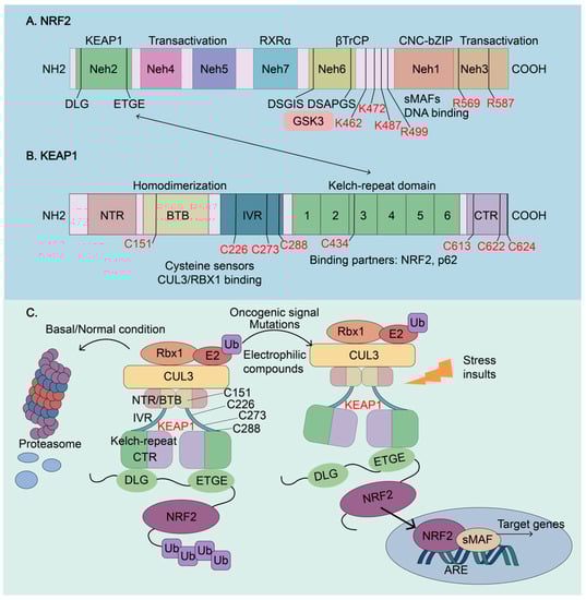 KEAP1 is a redox-regulated adaptor for the Cullin (Cul)3-RING-box protein (Rbx)1 ubiquitin ligase complex [51]. Structurally, KEAP1 contains five domains, an N-terminal domain (NTR), a Broad complex/Tram track/Bric-à-brac (BTB) domain for homodimerization, a central linker intervening region (IVR), a Kelch-repeat domain with 6 Kelch double glycine repeats (DGR), and a C-terminal domain (CTR) (Figure 3B) [52,53]. KEAP1 is one of the best-characterized redox sensors, harboring several sensor cysteines, especially cysteine 151 (C151), C226, C273, C288, C434, C613, and C622/624, which can be oxidized by ROS and other oxidants to sense the oxidative stress [54,55,56,57,58,59]. The H2O2 sensor of KEAP1 is distinct from that used for sensing electrophiles [56]. Under normal conditions, the ETGE and DLG motifs of NRF2 bind to a KEAP1 dimer [47], and the BTB domain of KEAP1 mediates the binding of NRF2/KEAP1 complex to the CUL3 for NRF2 ubiquitination and degradation (Figure 3C). During oxidative stress, electrophiles and oxidants induce alkylation or oxidation of KEAP1 cysteines and subsequently, conformational changes of KEAP1, resulting in the liberation of NRF2 from KEAP1-E3 ligase complex, disruption of ubiquitylation, and degradation of NRF2 allowing NRF2 translocation to the nucleus to activate the expression of antioxidant genes [54]. Therefore, KEAP1 is the central hub for sensing endogenous and environmental oxidative and electrophilic stress. The resulting newly transcribed and translated NRF2 can accumulate in the nucleus and lead to the activation of cytoprotective and metabolic genes that adapt to the hostile oxidative environment [43]. Many NRF2 activators are direct or indirect KEAP1 cysteine modifiers.