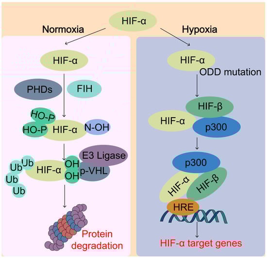 Sensing of O2 by hypoxia-inducible factor (HIF) system. Under normal oxygen conditions (normoxia), the HIF-α protein is rapidly hydroxylated by the prolyl hydroxylases (PHDs) enzymes, which enables the binding of von Hippel–Lindau (pVHL) E3 ubiquitin ligase complex, leading to ubiquitination and proteasomal degradation of HIF-α. On the other hand, the factor inhibiting HIF-1 (FIH) catalyzes specific asparagine hydroxylation of HIF-α, which blocks the transcriptional co-activator p300 from binding with HIF-α, thereby inhibiting HIF transcriptional activity. Under hypoxic conditions, the activity of PHDs and FIH is inhibited due to lack of O2, thereby lack of hydroxylation of HIF-α. Unhydroxylated HIF-α translocates to the nucleus, forms a complex with HIF-β and p300 targeting hypoxia response element (HRE), and activates transcription of HIF target genes. pVHL, von Hippel-Lindau tumor-suppressor protein; HIF, hypoxia-inducible factor; ODD, oxygen-dependent degradation domain; p300, Histone acetyltransferase p300.