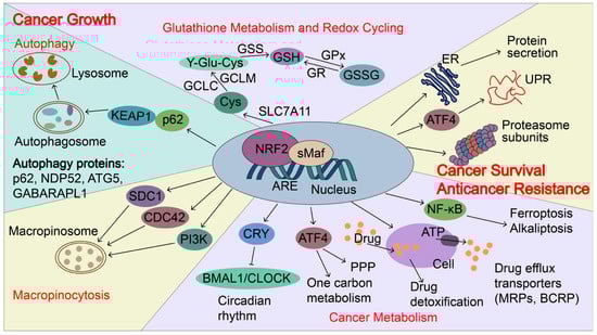 NRF2-induced targets regulate cancer growth, metastasis, and cancer drug resistance. In cancers, NRF2 signaling is aberrantly activated and NRF2 induces p62 expression and autophagy. p62 can directly interact with KEAP1, which causes NRF2 accumulation and KEAP1 degradation via the autophagy-related pathway. NRF2 transactivates the expression of genes encoding antioxidant proteins and drug-metabolizing enzymes, including glutathione metabolism and redox recycling. For example, NRF2 regulates the expression of SLC7A11 (xCT), Glutamate--cysteine ligase (GCLC and GCLM), and glutathione synthetase (GSS), all of which contribute to the elevation of reduced GSH levels. In addition, NRF2 regulates genes involved in autophagy, cancer metabolism, and macropinocytosis to support the nutrients demands for the rapid growth of cancer cells, including p62, antigen nuclear dot 52 kDa protein (NDP52), Autophagy protein 5 (ATG5), Gamma-aminobutyric acid receptor-associated protein-like 1 (GABARPL1), Syndecan-1 (SDC1), Cell division control protein 42 homolog (CDC42) and Phosphatidylinositol 4,5-bisphosphate 3-kinase catalytic subunit gamma isoform (PIK3CG). Furthermore, NRF2 regulates unfolded protein response (UPR), proteostasis, cancer metabolism, and drug detoxification, which confer cancer metastasis and anticancer resistance. NRF2 transactivates the expression of genes encoding proteasome subunits, drug efflux transporters, multidrug resistance-associated proteins (MRPs/ABCCs), and breast cancer resistance proteins (BCRP/ABCG2). NRF2 also increases ATF4 expression and coordinates with ATF4 to regulate cancer metabolism, UPR, and protein secretion, as well as to maintain the state of the drug-tolerant persister cells. Furthermore, NRF2 represses CLOCK/BMAL1-regulated circadian rhythm by inducing the expression of CRY2 and integrating cellular redox signals and metabolism to promote tumorigenesis, cancer growth, and drug resistance. NDP52, antigen nuclear dot 52 kDa protein; ATG5, autophagy protein 5; GABARPL1, gamma-aminobutyric acid receptor-associated protein-like 1; SDC1, syndecan-1; CDC42, cell division control protein 42 homologs; PIK3CG, phosphatidylinositol 4,5-bisphosphate 3-kinase catalytic subunit gamma isoform; BMAL1: brain and muscle ARNT-like protein1; CLOCK: Circadian locomotor output cycles kaput; CRY2: Cryptochrome 2; GSS, glutathione synthetase; MRPs, multidrug resistance-associated proteins; BCRP, breast cancer resistance protein; SLC7A11(xCT), Solute carrier family 7 and member 11 (Cystine/glutamate transporter); GCLC, glutamate-cysteine ligase catalytic subunit; GCLM, glutamate-cysteine ligase modulator.