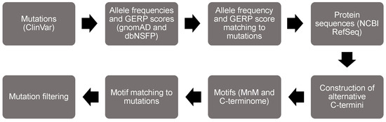 We designed a structured approach to screen for minimotifs in the C-termini that are mutated in human diseases (Figure 1). The first step in the flowchart was to parse missense and nonsense mutations from the ClinVar database [23,24]. We then extracted variant data from gnomAD and dbNSFP and matched it to the ClinVar data [25,26]. From there, we acquired proteome sequence data from the National Center of Biotechnology Information (NCBI) RefSeq database [27]. Next, we matched mutations to C-termini of each protein and created the alternative C-termini. We then parsed motif data from MnM and the C-terminome databases [7,8,10], using UniProt protein data in the process [28]. The motif data were matched to the disease mutation data to identify motif disruption mutations. We focused on PTMs because the amino acid that is covalently modified can confidently be assigned to be a LOF mutation when the chemistry is not possible. For example, substitution of a reference threonine with an alternative alanine necessarily prohibits phosphorylation. We also sorted out the subset of mutations classified as pathogenic or likely pathogenic. General statistics of our analysis are summarized in Table 2.
